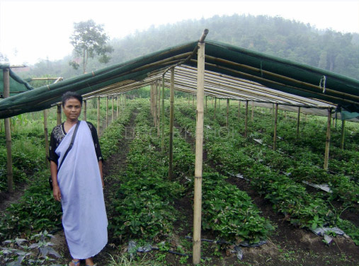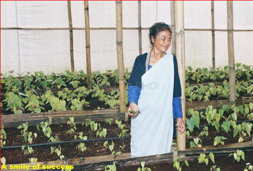 Having initially tried her hand at growing paddy, ginger as well as poultry, piggery and brick making, with not much success, Bernadette was selected as a floriculture beneficiary under the Technology Mission in 2002-03 and was provided with one low cost shadehouse, 6000 bulbs of Gladioli, 5000 Liliums, Amaryllis, Carnations and Hyacinth to test the suitability of these flowers in the area. Lilum and Amaryllis turned out to be successes but not Gladiolus while Carnations was successful but not profitable.