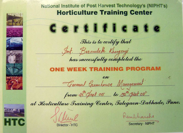 In conversation with us, Bernadette or Kong Ber as she is fondly called, informed that she is sending only liliums to the Dewlieh Horticulture Farm for grading, packing and marketing by ZOPAR Exports Pvt. Ltd, while her gerberas, Anthurium, potted plants, etc are being sold in the markets of Shillong as well as meeting home orders. Discovering that there exists a very good demand for potted plants, she has now taken the initiative to travel to nurseries in Assam to source good quality and exotic planting material, which she brings back, multiplies and then sells for a tidy profit. Recently she has also started the business of making bouquets for people which she says is slowly picking up. She has also participated in many seasonal flower shows being organized by the Regional Rural Training Center (RRTC) Umran as well as study tours conducted by the Department and has a sheaf of certificates to prove it.